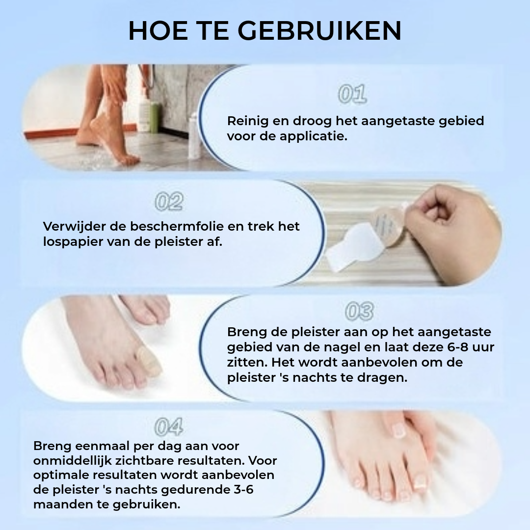 Maak de nagel schoon, breng de pleister aan en klaar—geen rommelige crèmes of vloeistoffen nodig. De sterke kleefstof houdt de pleister 6 tot 8 uur op zijn plaats. Ideaal voor drukke levensstijlen en past makkelijk in je dagelijkse routine of bedtijdroutine.