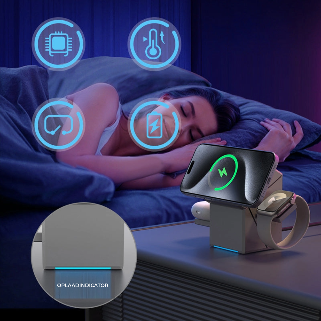 MAGNETISCH ONTWERP EN SNEL OPLADEN: Dankzij het krachtige magnetische ontwerp ondersteunt deze oplader tot 15W voor smartphones, 5W voor oordopjes en 3W voor smartwatches. Dit zorgt voor efficiënt opladen met een correcte uitlijning van elk apparaat.