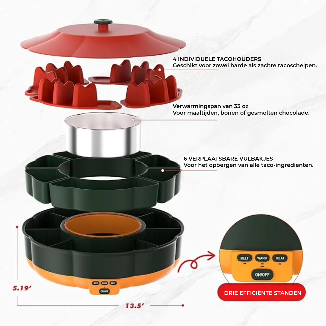 - Inhoud: Draaibare serveerschaal met 6 vakken, verwarmde pot, 4 taco-houders