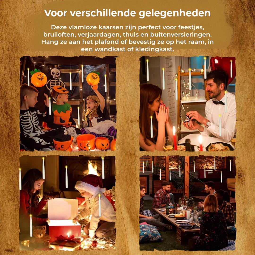 Met de Zwevende LED Kaarsen creëert u direct een betoverende atmosfeer die doet denken aan een sprookjesachtig kasteel of mysterieuze feestzaal. De kaarsen lijken vrij in de lucht te zweven, waardoor elke kamer een gevoel van verwondering en warmte krijgt. Perfect voor feestdagen, themafeesten en gezellige avonden.